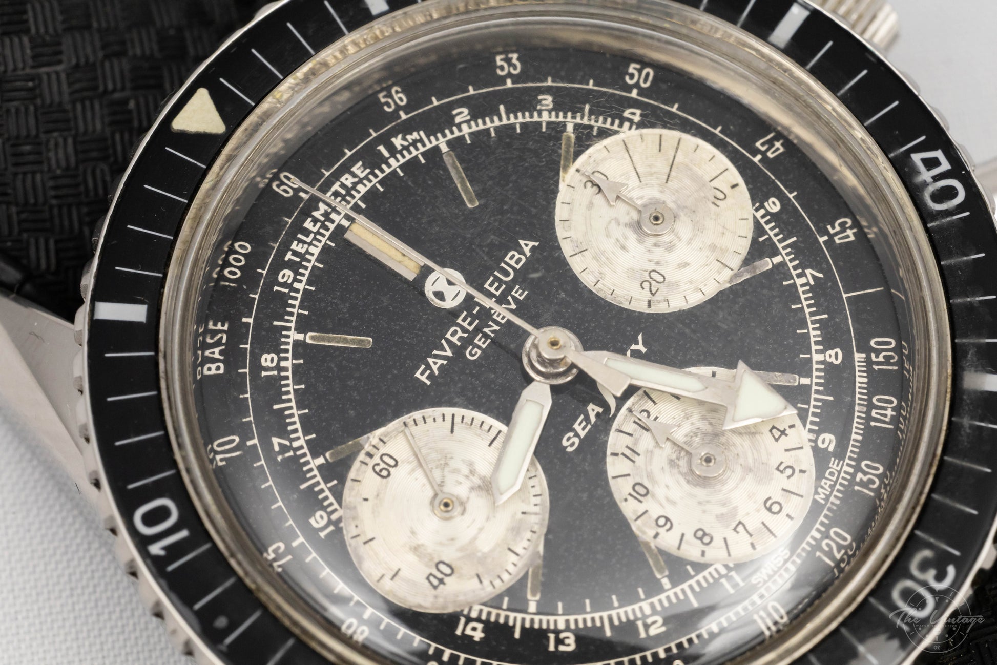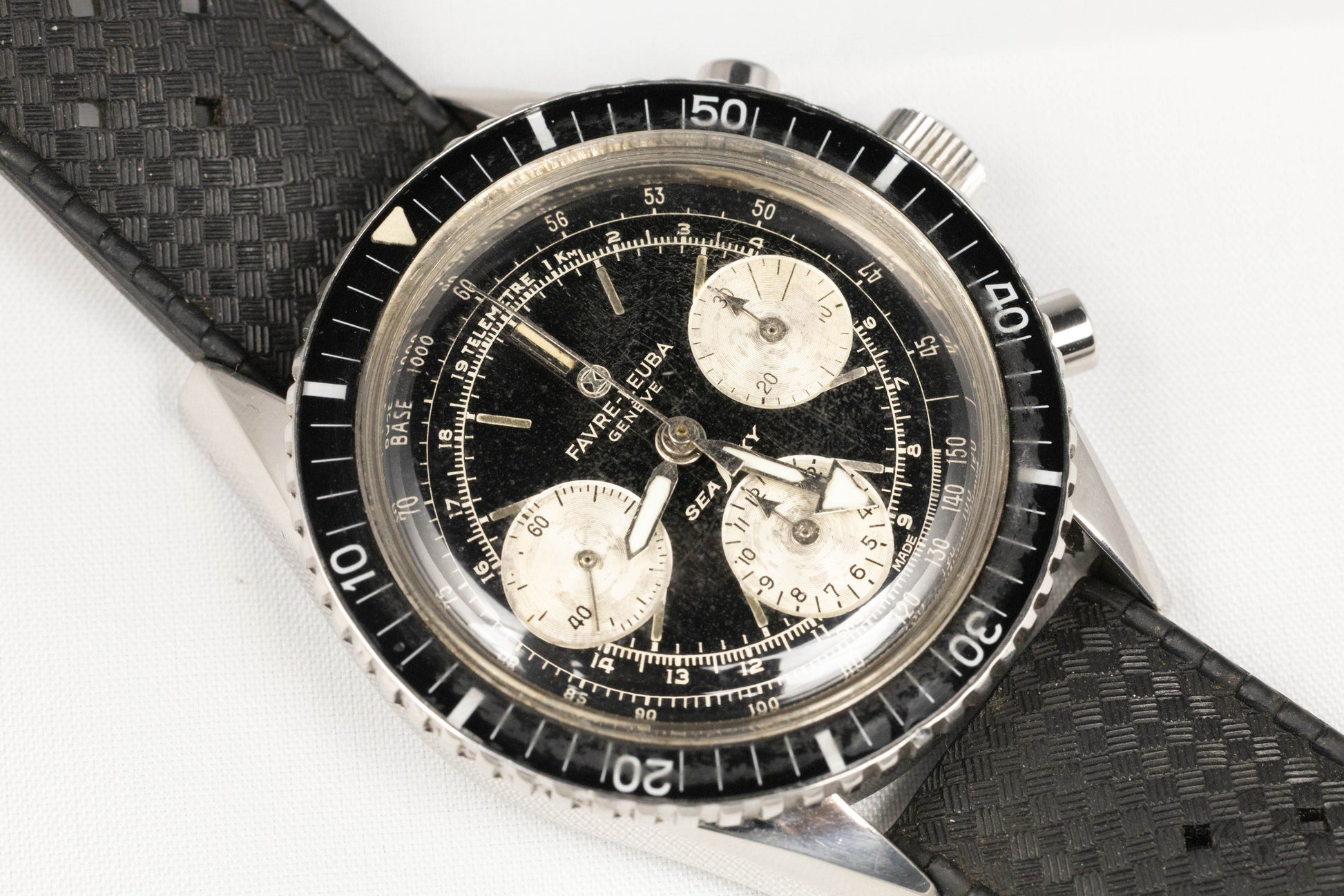 The Favre Leuba Sea Sky Chronograph ref. 33033, circa early 1960’s, is a distinctive vintage tool watch that blends classic Swiss craftsmanship with a sporty, rugged look. The 39mm stainless steel case was quite large for its time and includes a rotating countdown bezel that adds to its sporty and contemporary feel.