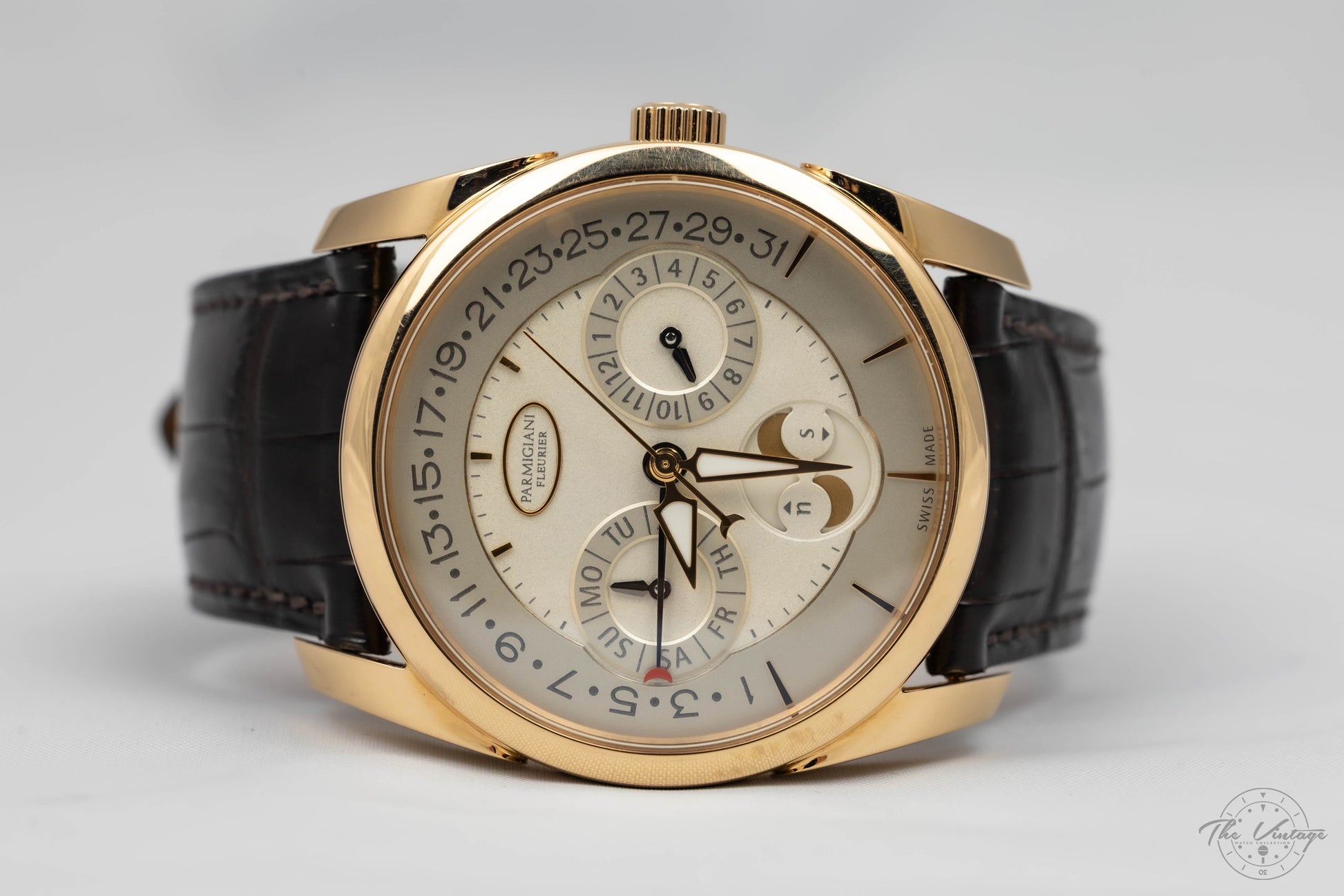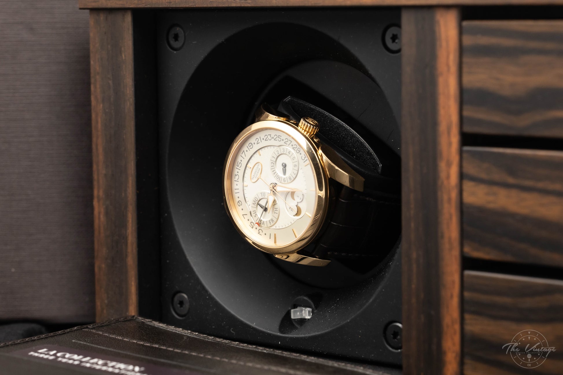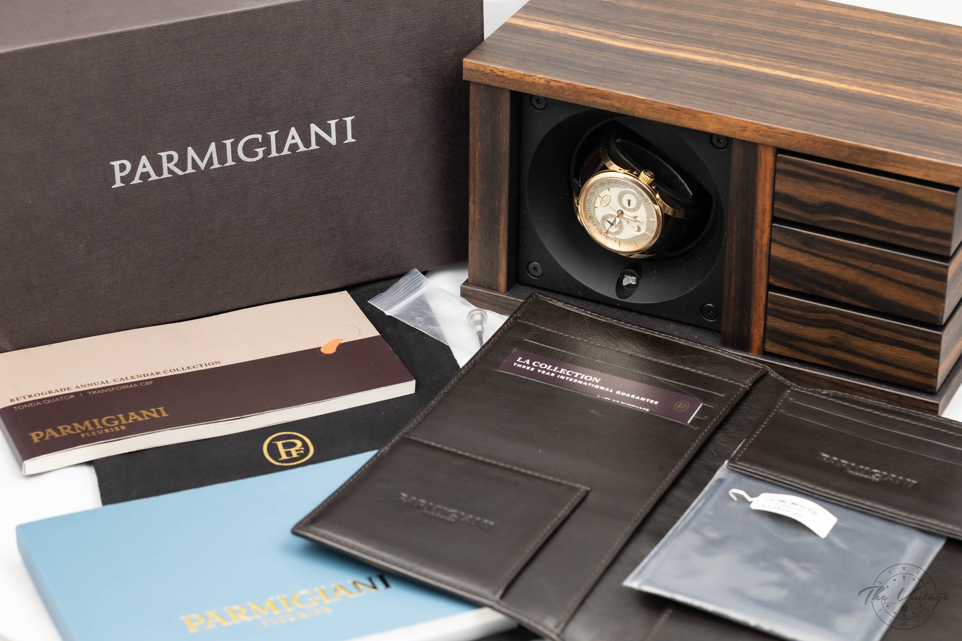 Includes Full Set with original wooden Parmigiani watch winder box, outer box, papers, and accessories.
