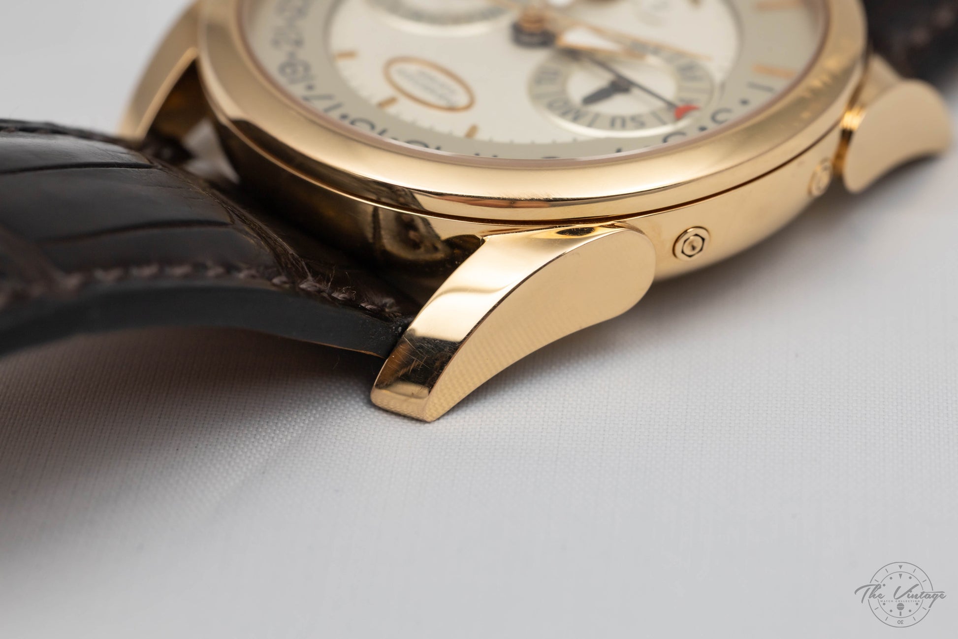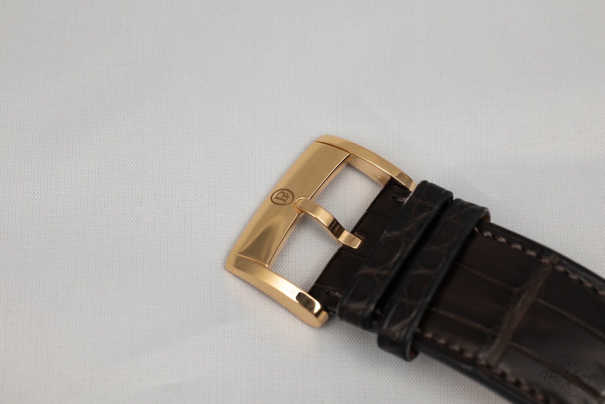 The Parmigiani Fleurier Tonda Quator Annual Calendar features a 40mm rose gold case with the brand’s signature teardrop lugs. The opaline silver dial has applied indices, delta-shaped hands, and displays for the day, month, moonphase, and a retrograde date at the top. The dual moonphase at 6 o’clock keeps the layout balanced and easy to read.